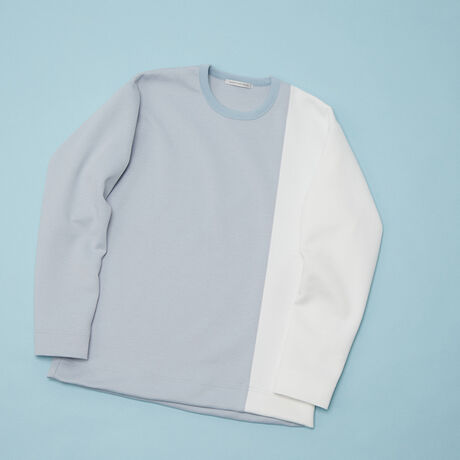 ・ニュアンスカラーで仕上げたバイカラー切り替えのテクニックデザイン。丁度良い軽さと重さに仕上げるため、Tシャツ以上トレーナー未満のデザインに落とし込んでします。