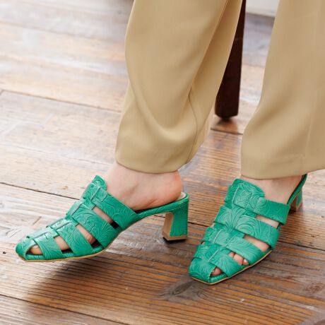 この春夏も大注目のグルカシューズの要素を取り入れたミュールサンダル。
