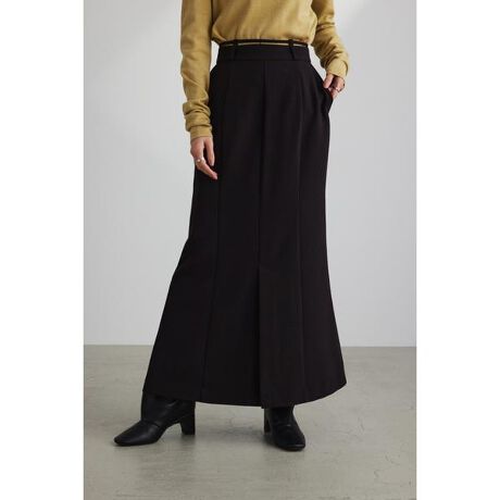 モデル身長162cm(Mサイズ着用)ウエストのベルトデザインがポイントのマーメイドスカート。フロントのベンツスリットで足さばきも良く、ロングブーツ合わせもおすすめです。ラインが響きにくい程よい厚みで編み立てています。透け感なし(膝上まで裏地付き)、ストレッチややあり。【お手入れ方法】手洗い可