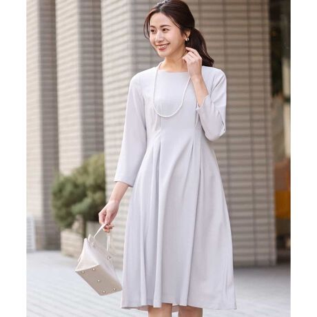 セレモニーなどのきちんとしたシーンにも好印象の膝が見えない着丈は座ったときも安心。ジャケットやコートとも相性良く着合わせられます。シンプルなデザインなので、ネックレスやブローチなど、お手持ちのアイテムで華やかさをUPさせても素敵に決まります。