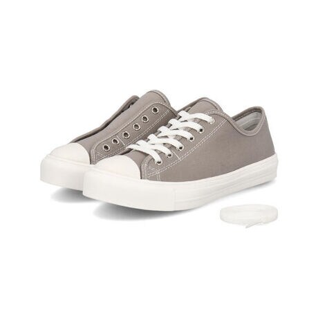 気のくすみカラーに、シルバーハトメがさりげないアクセントを添えるキャンバススニーカー。