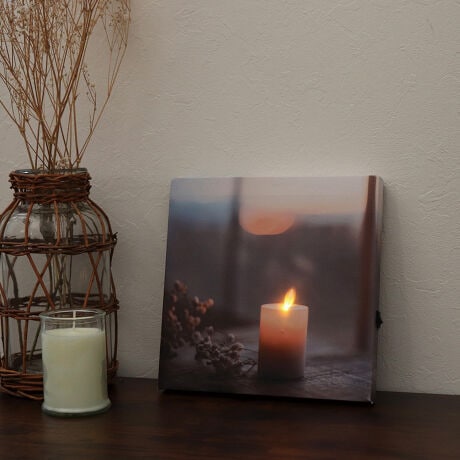 明るい時間はお部屋を彩るアートとして。夜は優しい明かりがお部屋をリラックスできる空間に。壁面に取り付けるキャンパスライトです。キャンドルのLEDライトが揺らめきます。