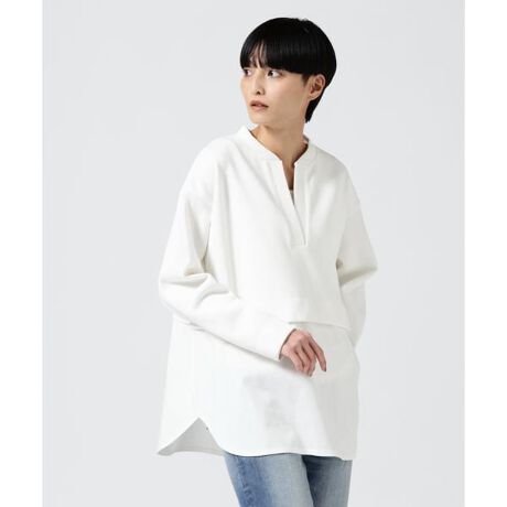 表側のリブ目はシャープな印象ですが、ダンボールニットのしっかりとした肉感とハリ感を楽しめ、伸縮性も通常のテレコ程はないので、サイズ感問わず身体のラインを拾いにくいのが特徴です。裏側は天竺見えする滑らかでサラッとした肌触りで、ストレスなく着用出来ます。ダンボール組織ですが、表面はほぼコットンなので、スポーティーさも抑えたナチュラルな素材感がアイテム問わず使い易いです。毛玉になりにくい特性もあるので長く着用いただける素材です。別布:布帛見えするキレイめな素材感でお馴染みの47/2サイロプレミアム天竺です。インドの超長綿をブレンドしたハイゲージのコットン天竺で、強撚タッチに撚糸して、ガス焼き加工による毛羽の少なさが特徴です。普通の綿素材では表現しにくい適度なハリ感と落ち感があり、シルクの様な軋み感も持ち合わせています。着用や洗濯を繰り返しても、毛羽立ちにくく、風合いも損ないにくいので、長くきれいに着られるのもこの素材の特徴です。ナチュラルながらも上質な光沢があり、ほどよい厚みもある安心感のある天竺素材です。DESIGN布帛タッチなシャツカーブのインナーに同色のスキッパーカラーのトップスを重ね着したイメージのドッキングプルオーバー。カジュアルにゆるく着られる全体のサイジングと、長めの丈感のバランスがポイント。身幅と肩幅を広めに取り、緩やかに落ちた袖が抜け感のある雰囲気を出しています。袖口にかけてタイトめなシルエットにし、カジュアルダウンしすぎないようバランスを取りました。リブ目の表情を持った素材感を生かし、衿ぐりや前立ても同素材でスッキリと仕立てています。抜け感のあるスキッパー開きにすることですっきりとした印象に仕上がっています。深めの開きなので衿からインナーを覗かせても可愛い着こなしが出来ます。カットソー同士の組み合わせですが、表面感の違いが楽しめ、どちらも目面がきれいなので野暮ったさは無く、程よく女性らしいきれいめな印象に仕上がりました。細身のパンツにもしっくり合いますが、あえてボリュームのあるスカートに合わせても今っぽいバランスが楽しめるアイテムです。【Munich / ミ