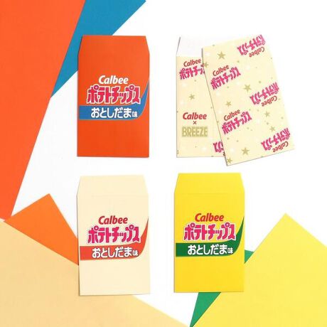 カルビーとして初めてのポチ袋をBREEZEで商品化!気になるお味は・・・おとしだま味?!うすしお味・のりしお味・コンソメパンチ味のおなじみのパッケージデザイン(各1枚)、ロゴ総柄(2枚)の全4種類5枚がセットになっています。裏側にはcalbee×BREEZEのコラボロゴを入れています。渡すタイミングで会話が生まれるような楽しいデザインに仕上がりました。今年のお年玉はCalbeeのポ(テ)チ袋で、初笑いを届けよう♪