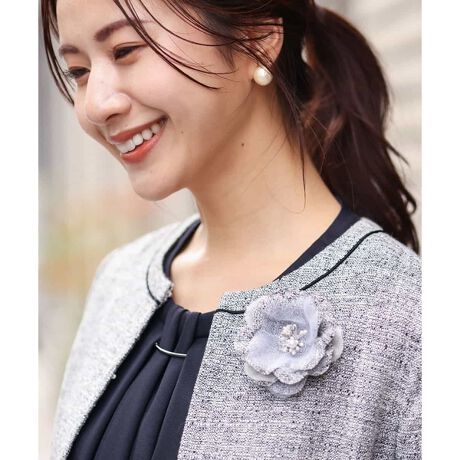 ブランドオリジナルのツイード生地を贅沢にあしらったカメリア(椿)型のコサージュ。お洋服を上品に引き立てて華やかな印象に。同ツイードを使用したジャケットと合わせれば統一感のあるスタイリングが完成します。クリップとピンの2way仕様になっているので、お洋服に穴を開けずに付けられるのも嬉しい。