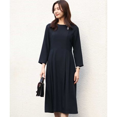 セレモニーなどのきちんとしたシーンにも好印象の膝が見えない着丈は座ったときも安心。ジャケットやコートとも相性良く着合わせられます。シンプルなデザインなので、ネックレスやブローチなど、お手持ちのアイテムで華やかさをUPさせても素敵に決まります。