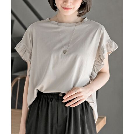 袖口のフリルがフェミニンな印象を与えるカットソーTシャツ。