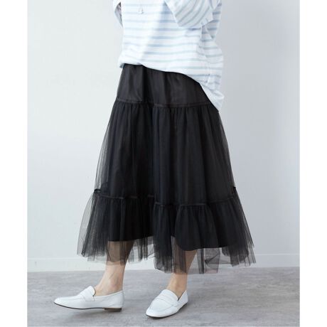 何段にも重ねたボリューム感のあるチュールは、ベーシックなアイテムはもちろんのこと、ジレやジャケットなど、辛口アイテムをコーディネートに合わせるのもオススメです。