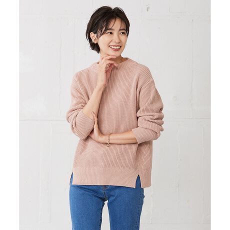 畦編みの畝目がきれいなミドルゲージの春ニット。すっきりと着こなしやすいボトルネックのデザインがポイントになり、さらに程よくゆとりを持たせたボリューム感のあるシルエットでストレスフリーな着心地を実現。裾にスリットを入れているため、前裾のみボトムスにインする着こなしもおすすめ。スカートを合わせた甘めなスタイリングにもマニッシュなスタイリングにもフィットする万能アイテムです。