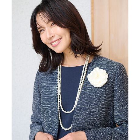 長めの2連フェイクパールネックレスと、コサージュのセットです。2連ネックレスは1本ずつ付けることも可能なので、シンプルにも使えます。コサージュは取り外し可能で単品でも使うことができるので、シーンに合わせたアレンジが楽しめます。コサージュの裏には安全ピンだけでなくクリップも付いているので、大切なお洋服に穴をあけてしまう心配もありません。