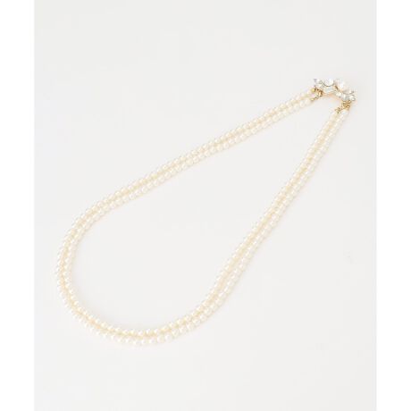 2連フェイクパールネックレスに取り外し可能なブローチが付いたデザインです。金具を外さなくても着けられるよう、頭からかぶれる長さに仕上げています。ネックレスは1本ずつ付けて頂くことも可能なので、シンプルにも使えます。ブローチは取り外し可能なので、単品でも使うことができます。