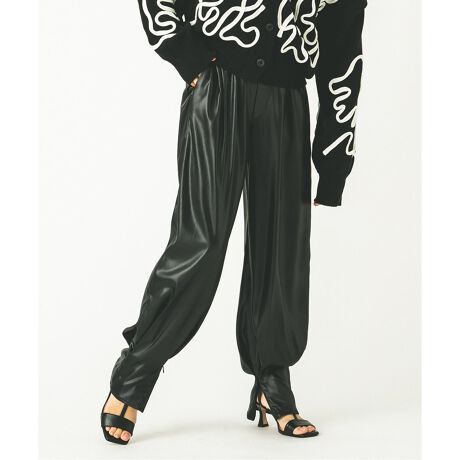 ◆裾がきゅっとシェイプされた雰囲気のあるサテンパンツ。