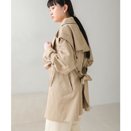 トレンチコートとしても、ベストとしても着用できる2WAYアイテム!ほどよく余裕のあるサイズ感で季節の変わり目に羽織りやすいアウターです。肩の所にはステッチを施しデザイン性を高めています。後ろのヨーク切り替えはほどよくフレアーが出るシルエットに仕上げています。袖口はベルトの絞り具合でキャンディースリーブにしたり、袖広にしたりと気分によって変えられます。