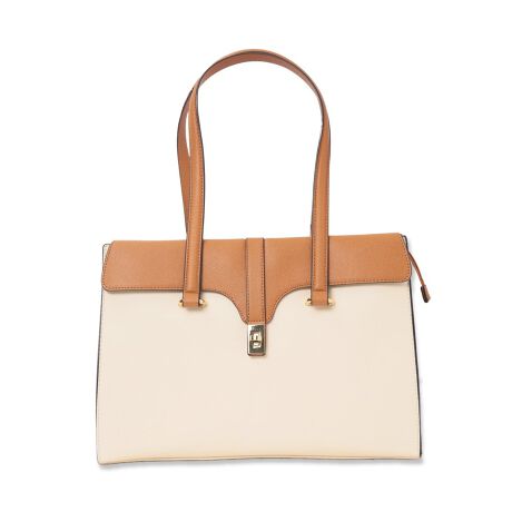 ゴールドの金具使いで綺麗目な雰囲気に仕上げたトートバッグです。肩に掛けやすい平手ハンドルは、荷物が重くても食い込みにくいソフトな質感です。中身の飛び出し防止や防犯面も安心な天ファスナー仕様。すぐに取り出すスマホや手帳等は、フロントのカブセポケットに収納可能です。