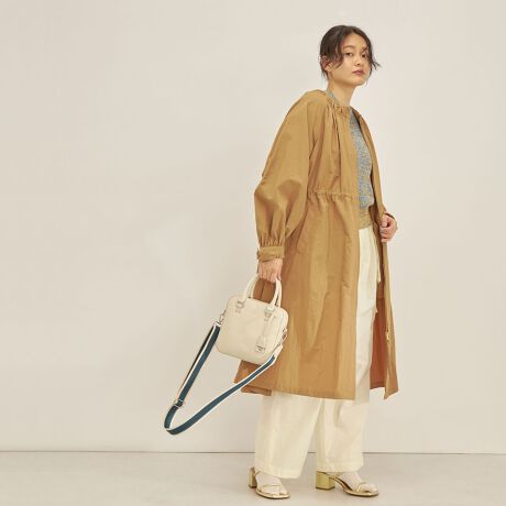 襟ぐりとウエスト、袖口にそれぞれギャザーを施したデザインで、ウエストのドロストでお好みのシルエットに調節していただけます。