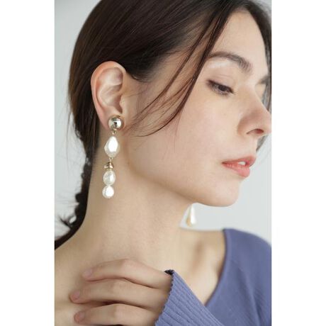耳元で揺れるアシンメトリーデザインのパールイヤリング左右でデザインが異なり、片耳用としても使えるアクセサリーです。タテに流れる大小のいびつなパール使いで抜け感をだし、顔まわりを華やに見せるアイテム。パールとゴールドカラーのパーツを組み合わせた肌なじみの良さも魅力。
