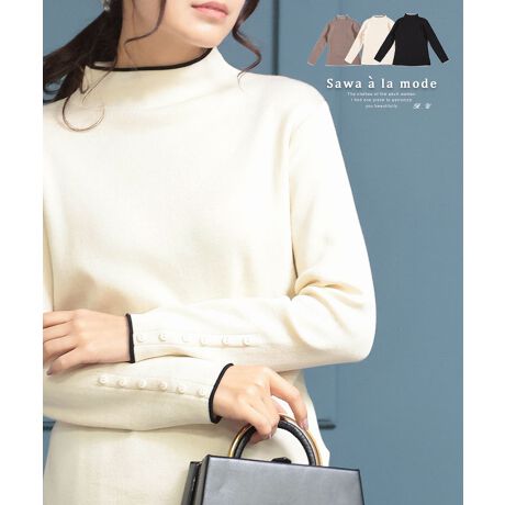 色んなスタイリングに活躍するもっちり柔らかニットトップス。襟や裾、袖口にデザインされたバイカラーのラインがお洒落な1枚です。襟元はハイネックなので顔周りをすっきりと見せてくれます。シンプルなのでボトムスを選ばず幅広く着まわして頂けます。もっちりと柔らかなニット生地は着心地の良い肌触りです。