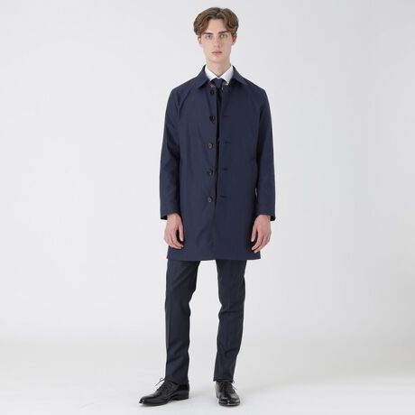 ビジネスシーンからニット合わせまで幅広くコーディネート可能な、ストレッチ性のあるシンプルなギャバジンで仕立てたステンカラーコート。裏地と、衿裏には、アイコニックなクレストブリッジチェックを使用したオリジナリティあふれるデザインです。ロゴを刻印したオリジナル釦に、ウレタンコーティングを施し、立体感のある光沢に仕上げています。