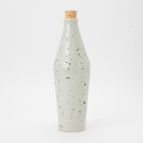 信楽の粘土から採取された、ラジウム鉱石を含む原土を使用した陶器のボトルです。ラジウム鉱石から出るアルファ線によりマイナスイオン効果がもたらされ、例えばお酒類ならアルコール分子の周りに整列した水分子が取り囲み、味をまろやかにします。イオンボトルに入れた水は、アルファ線によって攪拌(かくはん)作用が起き、この作用によりボトルの中の水はイオン化し、川が流れてせせらいでいる状態となり、おいしい水となるのです。