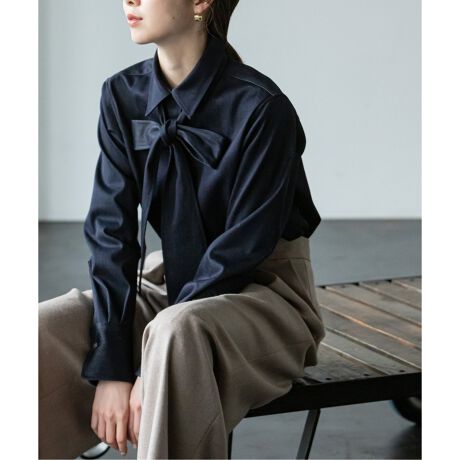 リボンタイブラウスをシルク混のデニム素材落とし込んだことで、新鮮な着こなしを叶えてくれる1着。