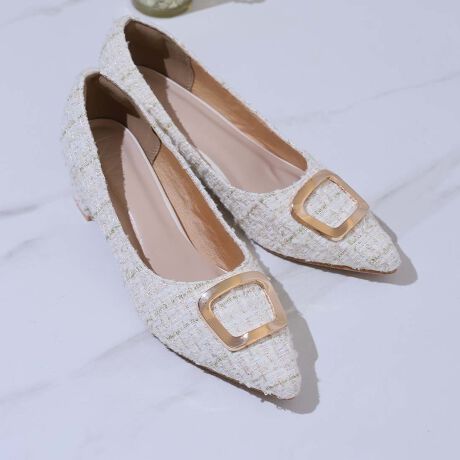 ・ポインテッドトゥ×ブロックヒールで甘くなりすぎない上品フォルム。