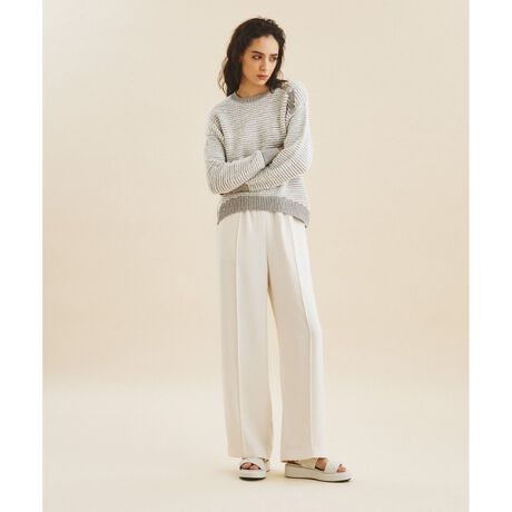 どんなコーディネートにもスマートに溶け込む、着心地の良いイージーパンツ。適度なとろみとナチュラルストレッチが効いたバックサテンジョーゼット地を使用。ウエストのみサテン面を使用して、デザインポイントとして効かせました。もたつき感がなくルーズになり過ぎない絶妙なシルエットに拘り、大人の女性が品良く穿けるように仕上げています。定番として使えるブラックとキナリ、春気分高まるピンクの3色をご用意。リラックスムードとトレンド感をプラスしてくれる、ワードローブの新定番パンツです。