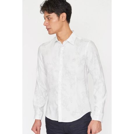 花と爬虫類の異種ミックスモチーフを、白ボディに細線でさらっと描くことで、白シャツライクに取り入れやすい柄シャツに仕上がっています。