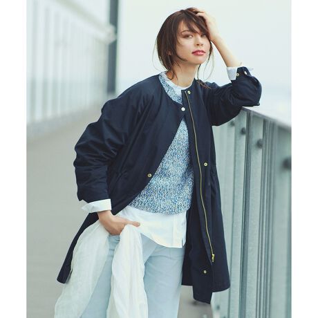 大人カジュアルな着こなしがかなうノーカラーのツイルアウター。腰周りがしっかり隠れる長めのレングスで、程よくゆとりのあるシルエットです。ウエストにはドロストコードをあしらい、絞ることでシルエットの変化が楽しめます。袖口はドット釦で開閉可能、アジャストすることで袖口を細くでき、たくし上げやすくなっています。部分的にあしらったゴールドの付属で女性らしさをプラス。首元がすっきりしたデザインなのでスカーフやストールのアレンジもしやすいです。袖にゆとりがあるので厚手のニットを着ても着ぶくれせず、合わせるインナーを選ばずスタイリングが可能なアウターです。また、手洗い可能でケアができるのも嬉しいポイントです。カラーは、女性らしく柔らかな印象のベージュ(#033)、ミリタリーな雰囲気も楽しめるオリーブ(#055)、シックで落ち着いた印象のネイビー(#075)の3色展開です。