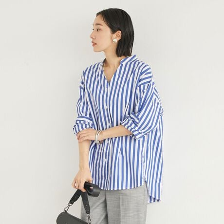 ワイドなストライプが印象的なシャツ。スキッパータイプで首元はすっきり。縦のラインが強調されスタイルアップも♪前開きのアイプなので羽織でも着用可能。春らしいピンクは着るだけでサマになる映えアイテム。