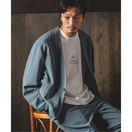 素材を活かしたノーカラージャケットはビジネスシーンからカジュアルスタイルまで幅広く活躍します。
