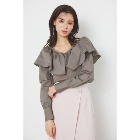 布帛のフリルコンビデザインがフェミニンな雰囲気を醸し出すニットTOPS。オーバーカラーにすることで二の腕を細く見せ小顔効果を発揮。またデコルテを華奢に見せてくれるストラップを付けレディ感をプラスしました。襟周りはボリューム見えし、身頃は相反したタイトシルエットなのでスタイル良く見えるんが嬉しいポイント。どんなアイテムにも着やすいWHTに、クールな雰囲気を醸し出すBLK、大人な印象を与えるBEG、お洒落なPURの4色展開です。