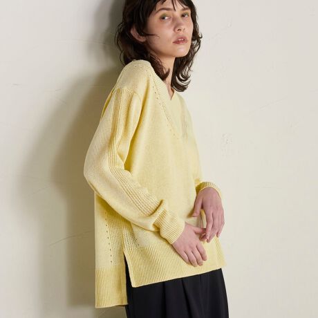 シンプルながらもネックや脇に編地でポイントを入れたこなれたニットです。
