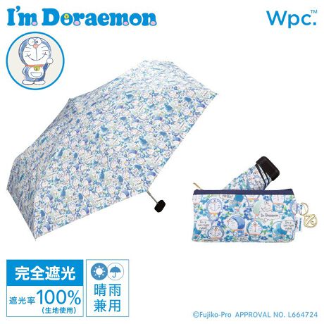 ドラえもんとお花がいっぱいデザインされた色鮮やかなブルーの日傘。
