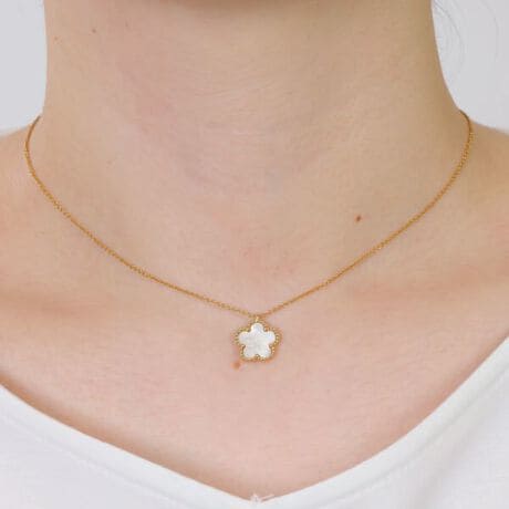 [型番:223-901200]ひとつひとつニュアンスの異なるデイジーが目を引くシリーズ。シルバーには黒の天然石、ゴールドには白蝶貝で表現したデイジーを組み合わせ、フレームには細かくミルを施すなど、細部までたっぷりとこだわりました。ネックレスは、ほど良い長さのチェーンで、デコルテを上品に演出します。