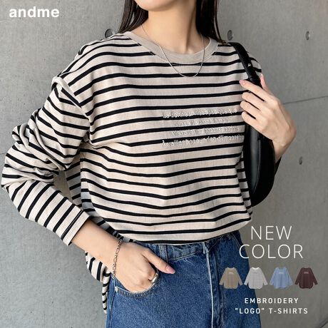 無地 ボーダー エンブロイダリー ロゴ コットン 長袖 Tシャツ