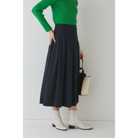 【デザインポイント】程よいボリュームのタックスカート。前後に見えてくるインバータックとカットラインがポイントです。足元を選ばないオン・オフに使用できるスカート。
