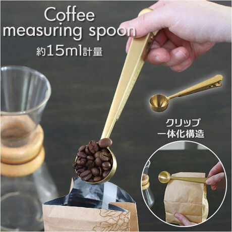 コーヒー豆の袋をパチンッと挟めるクリップ付き!コーヒーブレイクに欠かせない「BONOBONO コーヒーメジャースプーン」が新登場。コーヒーの粉やコーヒー豆をすり切りで約15ml計量できる、シンプルなメジャースプーン。計量後の袋をきちんと密閉できるクリップ一体化構造で、コーヒースプーンの収納場所に困らないのが嬉しいポイント!鈍い輝きが食卓をお洒落に引き立てる!本格的なバリスタ気分が味わえる、ブラスカラー(真鍮色)がスタイリッシュ。丈夫で錆びにくい表面チタン加工を施したステンレス製。スプーン約大さじ1杯分なので、コーヒーの計量にはもちろん、小麦粉やグラニュー等などお菓子づくり時の計量スプーンとしても大活躍。・「BONOBONO」とはイタリア語で「美味しい」を意味する言葉。毎日の食卓の「美味しい」を応援する、便利で見た目も華やかなアイテムシリーズ。