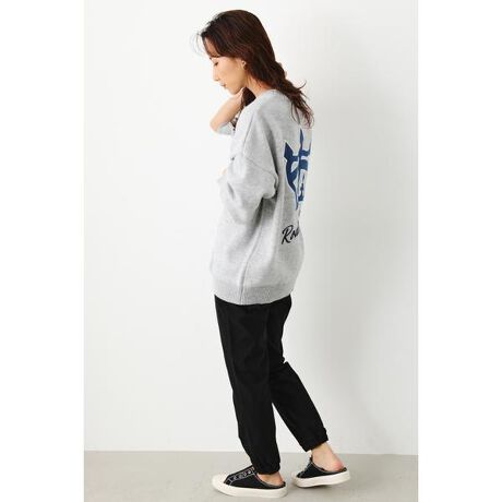 デニムのアップリケの王冠がバックに施されたインパクトのあるデザインのニットトップス。ゆったりめのシルエットなので、ボトムも合わせやすいアイテムです。