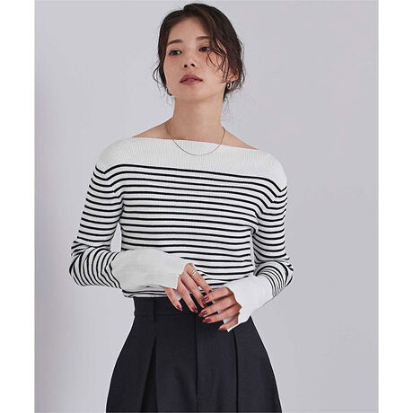 ボートネックでデコルテを綺麗に見せられるシンプルなリブニット。