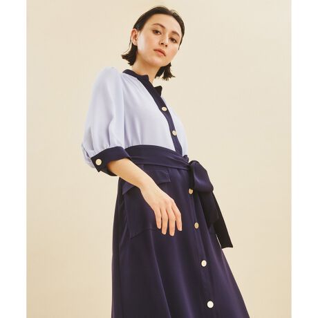 大人の上品なお出かけ着にぴったりな、カラーブロックシャツワンピース。細番手の糸を使用した落ち感の綺麗な薄手のダブルトリアセ素材を使用し、バイカラーでメリハリをつけた甘すぎないデザイン。ふんわりとしたスリーブや大きめのウエストリボン、そしてフロントとポケットにリズミカルに並べた金ボタンなど、品の良さを感じられる女性らしい一枚に仕上げました。お食事会や卒入学などの式典、謝恩会やお仕事シーンまで、幅広い場面にご活躍いただける即戦力ワンピースをこの機会にぜひ。