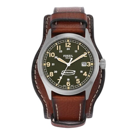 40mm径のケースにソーラームーブメントを搭載したDEFENDER。グリーンのマットダイヤルに、ミディアムブラウンのエコレザーストラップを組み合わせました。