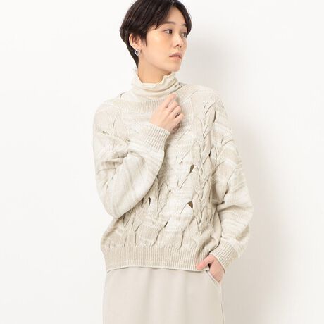 ケーブル柄に穴を開けたのではなく、テープ状に編んだケーブル柄を接ぎ合わせて、部分的に留めない部分を穴としてデザインしたニットです。
