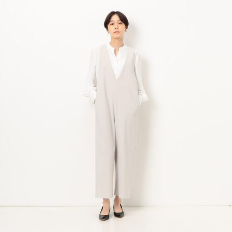 深めのVネックがシャープな印象のサロペットです。