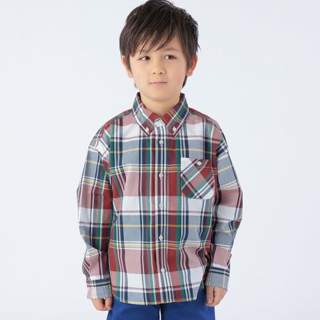 白地に赤とネイビーのチェック地(ホワイト系)は、美しい微光沢感が特徴の50番手の綿糸を使用し、カジュアルになりがちなチェックシャツを上品な印象に。
