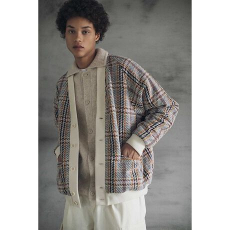 太番手で織られた立体感と奥行きのあるチェック素材を使用したカーディガン型アウター。