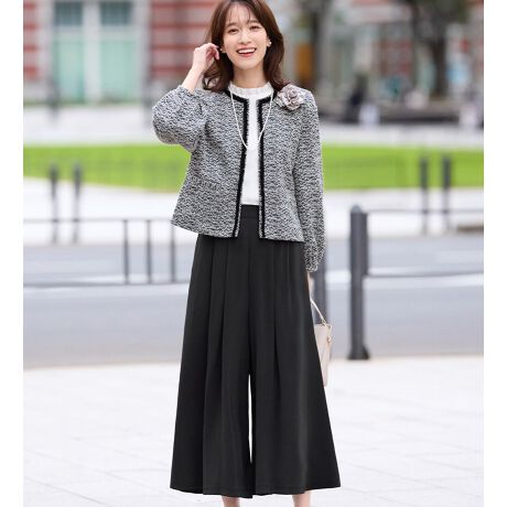高見えするツイード調のジャケットと、ハリ感のある本格仕様のワイドパンツで大人にぴったりの装いに。