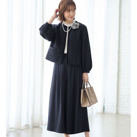 高見えするツイード調のジャケットと、ハリ感のある本格仕様のワイドパンツで大人にぴったりの装いに。