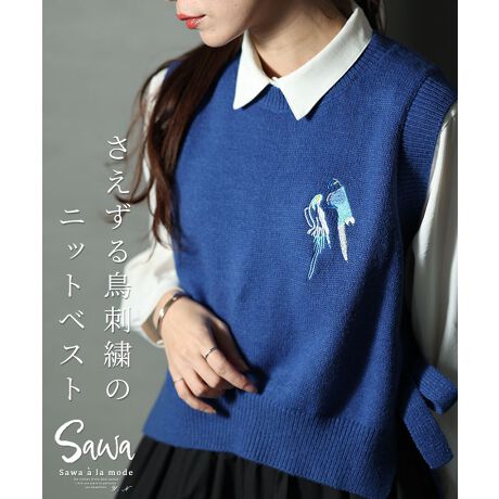 【ベスト】レディース ファッション ニットベスト ブルー 青 刺繍 鳥刺繍 クルーネック スリット