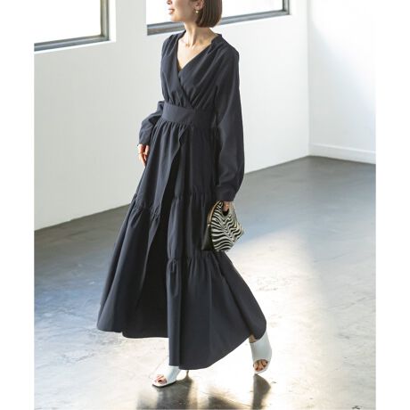 スカート部分はアシンメトリーなティアードで歩くと足がやや覗くラップデザインとなっており、一枚で着映えが叶うワンピースです。