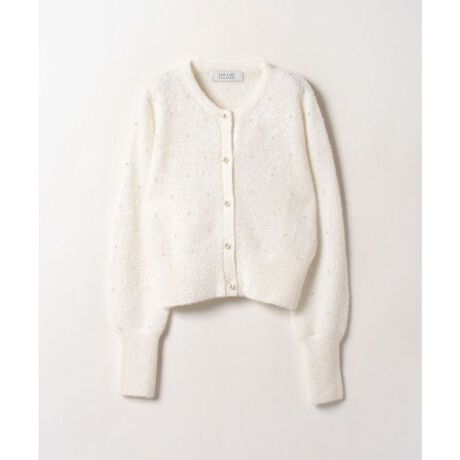 起毛感のあるふわふわニットに、ラメとパールスタッズを散りばめた長袖カーディガン。ロマンティックなきらめきが品のよさ溢れる華やぎを醸し出すアイテムは、フロントボタンを留めてプルオーバーのようにスタイリングするのが気分。フィッティングモデル(詳細画像)163cm B75 W62 H90 着用サイズ:02(M)